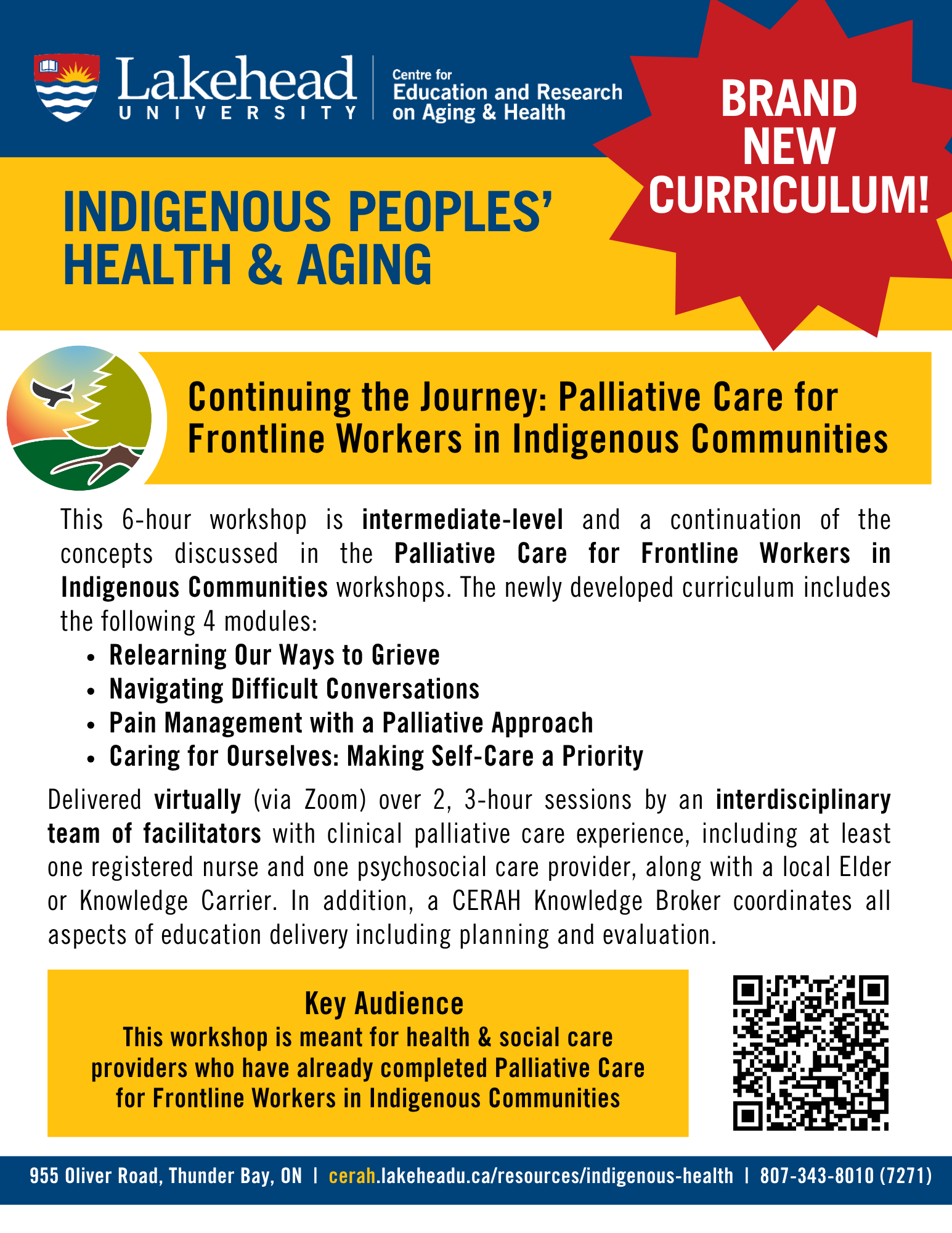This newly developed curriculum builds on the foundational knowledge provided in Palliative Care for Frontline Workers in Indigenous Communities curriculum, developed by CERAH.